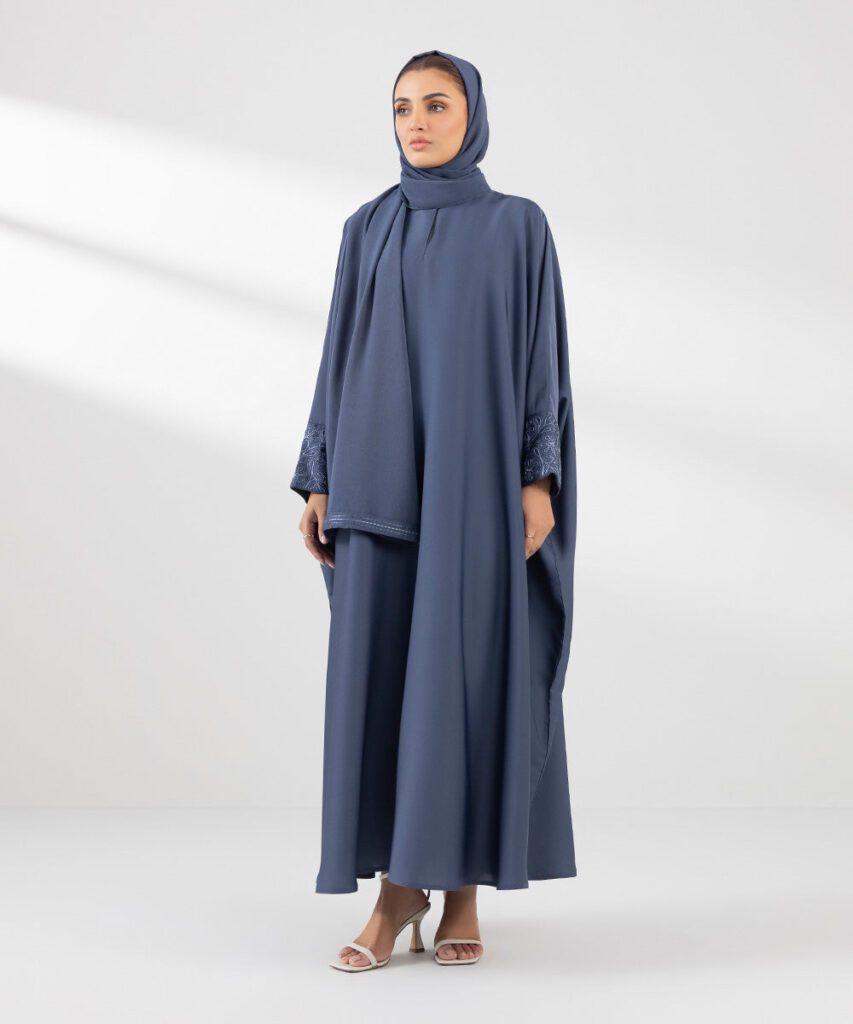 Full length kaftan abaya set in soft and drapey nida fabric. Featuring crew neckline with long slit and fabric button closure. Embroidery detail on cuffs. Embroidered hijab included. Details: Size & Fit